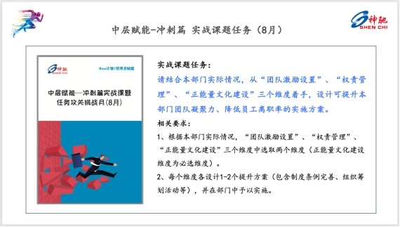 “冲刺篇”旨在助力集团公司各层级管理人员精进管理技能、熔炼高绩效团队;本篇章根据管理人员层级不同共涵盖“激励管理”、“授权管理”、“团队文化塑造”、“组织建设”、“教练技术”、“向上管理”、“沟通与协同”7个维度,并配套《管理真相》、《助力“新生代”成长》等系列型管理技能进阶课程;通过“线上课程学习+线下成果转化”的培训形式,帮助管理人员实现从知识输入、技能提升到高绩效输出的强有力转换。此外,为进一步打通理论与实践的转化链路,“冲刺篇”为中层学员定向设置了“任务攻关挑战”环节。在该环节中,学员需以部门为单位组成学习小组,共同研究、攻关委派的课题任务并出具具体、可行的实施方案在部门内予以实施。
